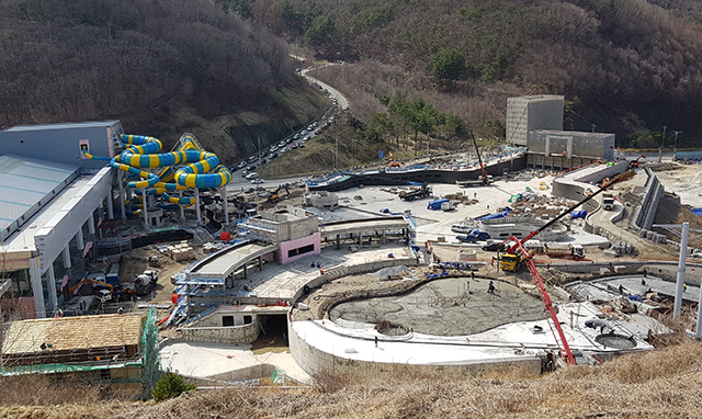 강원랜드 워터파크 공사가 계속된 한파와 폭설에 따른 공기지연에도 불구하고 7월 개장에 박차를 가하고 있다.