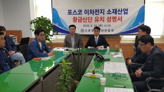 광양시 청년연합회 정현충 회장은 19일 오후 2시 광양시청 브리핑룸에서 20여명의 연합회 임원과 읍·면·동 회장이 참여한 가운데 기자회견을 갖고 “포스코 이차전시 소재산업이 황금산단에 유치돼야 한다”고 밝혔다.