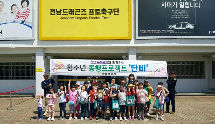 광양경찰서(서장 박종식)는 21일 청소년 동행 프로젝트 ‘단비’ 1차 프로그램으로 지역아동센터 23명 학생들을 선정하여 함께 전남 드래곤즈 축구 경기를 관람했다.