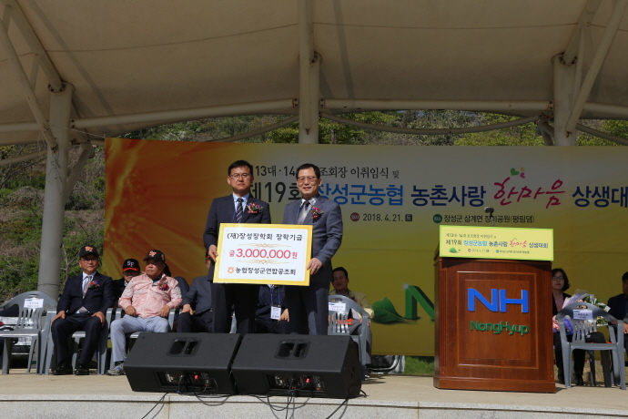 농협장성군연합공조회(이하‘농협공조회’)가 지난 21일 열린‘제19회 장성군농협 농촌사랑 한마음 상생대회’에서 장성장학회에 3백만원 쾌척해 지역사회를 훈훈하게 하고 있다.