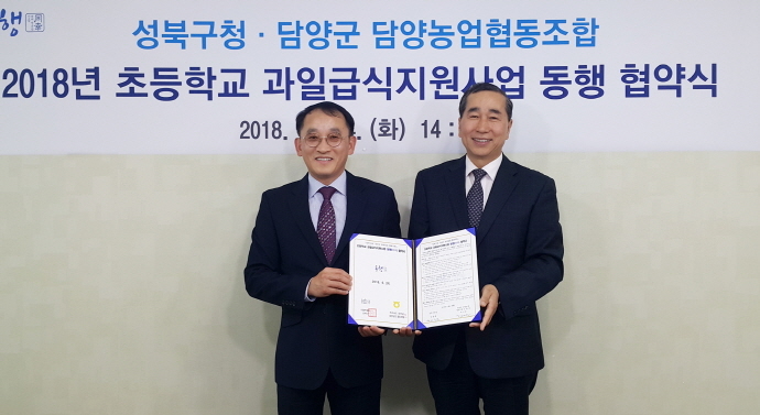 이번 협약은 2018년 서울특별시 성북구 관내 초등학교 과일급식 지원사업 공급주체로 담양농업협동조합이 선정됨에 따른 것으로 양 기관은 자라나는 어린이들의 건강증진과 농업인 소득안정에 기여하기로 뜻을 모았다.