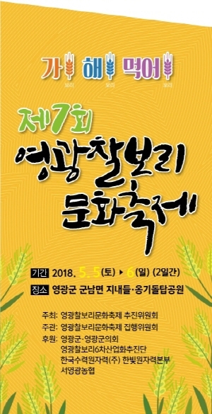 올해로 제7회를 맞는 영광찰보리문화축제는 보리비빔밥 퍼포먼스 등 개막행사 8종목, 어린이 트로트 가요제, 전국 팔도 품바 경연 대회 등 문화행사 15종목, 보리 재료 생활음식 전시관 운영 등 전시행사 5종목, 찰보리밭 동물농장, 찰보리밭 장어 잡기 등 18종목 등 모두 50종목의 다채로운 행사가 마련되어 색다른 추억과 감동을 선사할 계획이다.