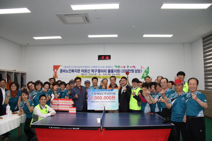 보해양조(주)순천지점(지점장 김상호)에서는 2018년 4월 26일(목)15:00 중마노인복지관 체력단련실에서 이웃사랑실천을 위해 (재)광양시사랑나눔복지재단(이사장 서경석)에 성금 200만원을 전달했다. 이번에 전달된 성금은 중마노인복지관의 어르신 탁구동아리에 지정기탁 되어 어르신들의 건전한 여가활동과 건강 증진을 위해 사용될 예정이다.