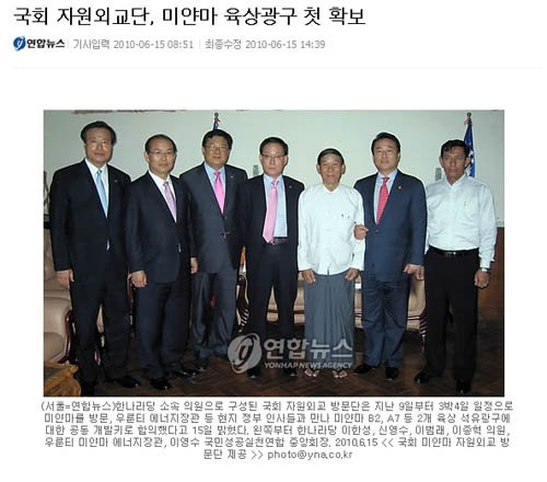 | ▲ 한나라당 의원들은 정부가 미얀마 해상 광구를 '빈광구'로 판명하기 전 이명박 대통령 측근인 이영수 KMDC 회장과 함께 미얀마를 대거 방문했었다. |