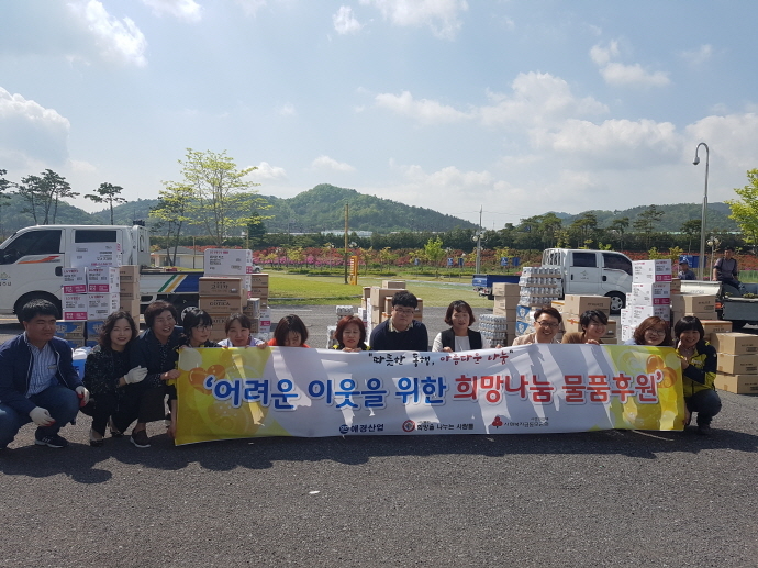(사)희망을 나누는 사람들은 이날 LG생활건강에서 후원한 샴푸, 치약, 세제 등 생활필수품과 애경산업(주)의 화장품, 코카콜라에서 후원한 음료 등 기업 후원 물품을 나주시에 기탁했다.