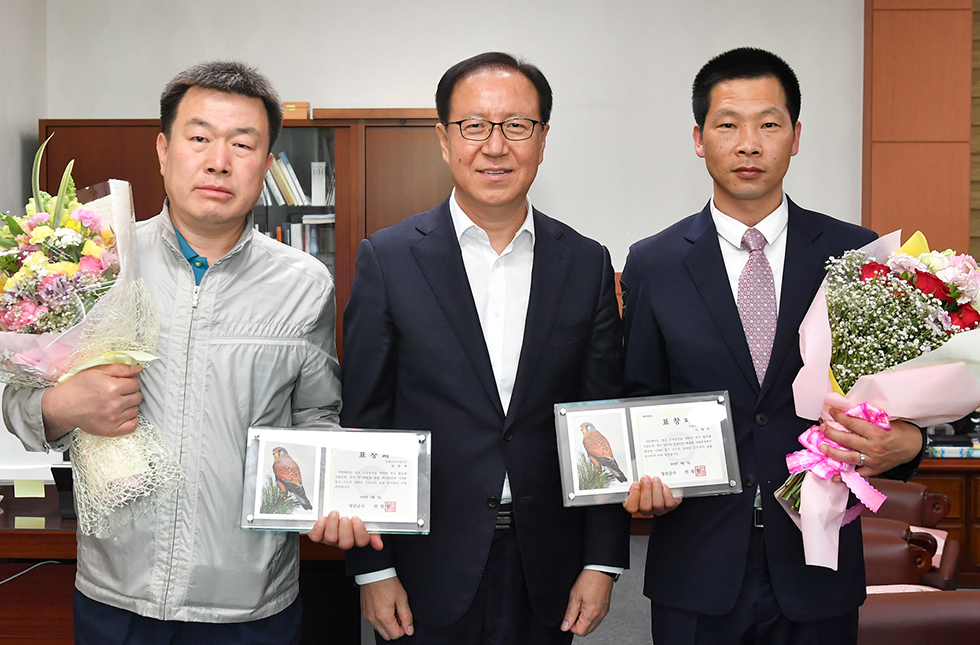 ▲전정환 강원 정선군수가 30일 집무실에서 2018년 근로자의 날을 맞아 지역 및 기업발전과 소통을 통한 노사협력으로 건전하고 행복한 직장분위기 조성에 기여한 강원남부주민㈜ 이영우·남만영, ㈜강원랜드노동조합 배용철 부위원장에게 모범근로자 표창을 수여하고 격려하고 있다. ⓒ정선군