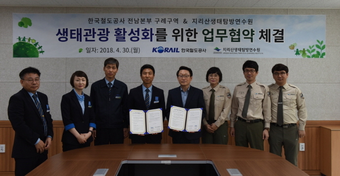 코레일 전남본부 구례구역과 국립공원관리공단 지리산생태탐방연수원은 4월 30일 철도와 연계한 지역경제 및 생태관광 활성화를 위하여 업무협약(MOU)을 체결했다.