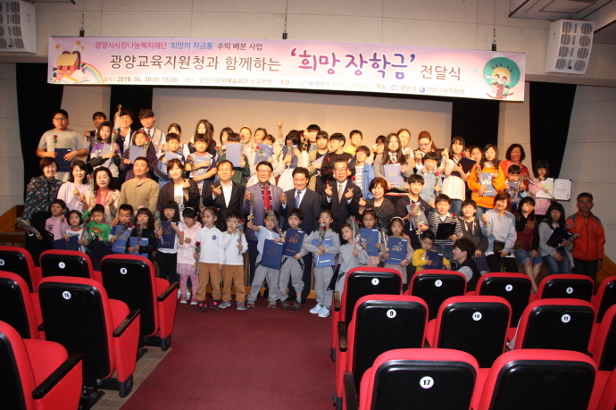 (재)광양시사랑나눔복지재단(이사장 서경석)에서는 4월 30일 오후 3시 광양문화예술회관에서 2018년도 희망 장학금 전달식을 개최하고 관내 어린이, 초·중·고등학생 58명에게 장학금 1천만원을 전달하였다.