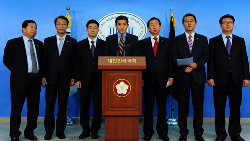 | ▲ 한나라당 의원들이 지난해 12월 국회 정론관에서 기자회견을 갖고 "물리력을 동원한 국회 의사진행에는 동참하지 않을 것"을 선언하고 있다. 이날 선언엔 한나라당 의원 22명이 참여했다. 왼쪽부터 구상찬 김성식 김세연 홍정욱 김성태 황영철 정태근 의원. ⓒ뉴시스 |