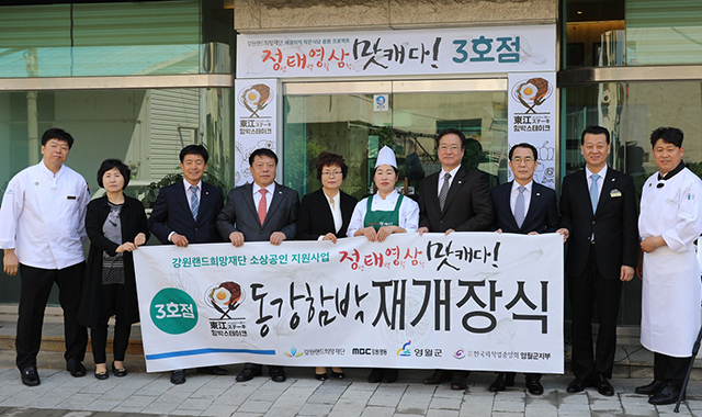 이날 개장식에는 점주 원미자씨를 비롯해 권순매 영월군 주민생활지원과장, 장재덕 한국외식업중앙회영월군지부장, 장학도 강원랜드희망재단 이사장, 강원랜드 재능기부 직원 등이 참석해 ‘동강함박’의 새 출발을 응원하고 성공을 기원했다.