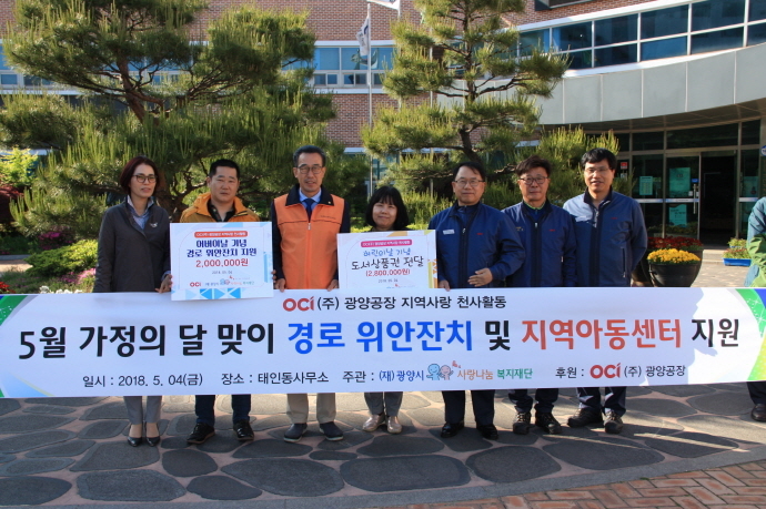 OCI(주) 광양공장(공장장 이동률)에서는 지난 2018년 5월 4일(금) 4시 30분 태인동 주민센터에서 가정의달을 맞아 (재)광양시사랑나눔복지재단(이사장 서경석)에 지정기탁 사업비 480만원을 전달했다.