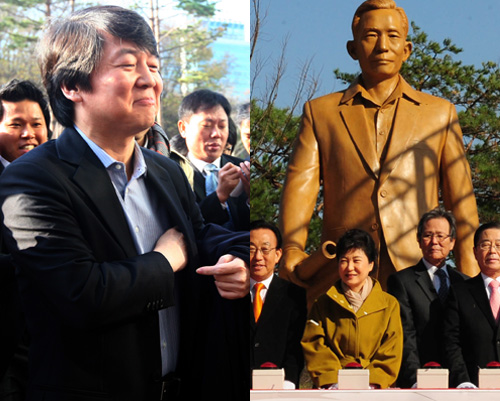 안 원장의 재산 출연이 알려진 14일 공교롭게도 박 전 대표는 경북 구미를 찾아가 박정희 전 대통령 동상 제막식에 참석했다. 다음 날 안 교수의 기부 내용이 신문 1면을 차지할 때 박 전 대표는 박정희 전 대통령의 구릿빛 동상 앞에서 찍은 사진이 실렸다. 안철수와 박근혜의 이미지가 뚜렷하게 대비된 풍경이다.