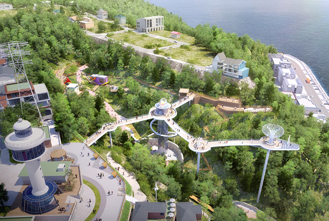 이어 하늘 광장부에는 바다 풍경과 어우러진 테마 조형물이 들어설 전망대와 포토존이 조성되며, 바다 속으로 들어가는 느낌을 살린 이색 엘리베이터 도입으로 재미는 물론 장애인 및 노약자를 위한 이동 편의를 동시에 추구하게 된다.
