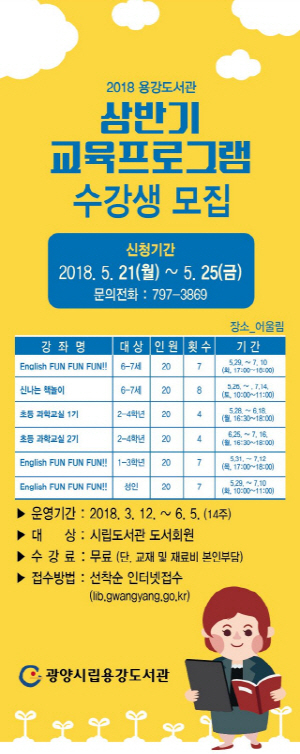 이번 강좌는 오는 5월 26일부터 7월 16일까지 진행되며, 이용자의 요구를 반영한 맞춤형 프로그램으로 유아 2강좌, 초등 3강좌, 성인 1강좌 총 6개의 강좌로 구성됐다.