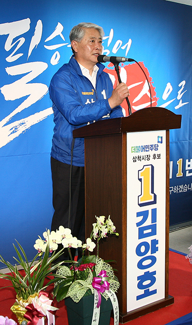 김양호 더불어민주당 강원 삼척시장 후보는 지난 12일 선거사무소 개소식에서 “삼척의 지속 가능한 발전을 위해서는 힘 있는 여당 시장이 꼭 필요하다”고 말했다.