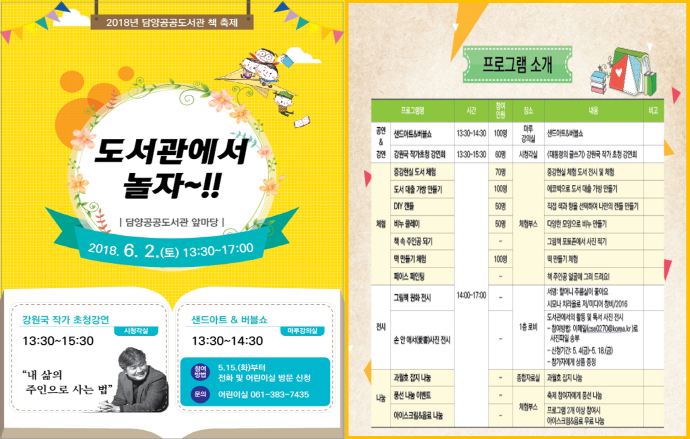 담양공공도서관(관장 김종성)은 오는 6월 2일 도서관 앞마당에서 2018년 책 축제 ‘도서관에서 놀자’가 펼쳐진다고 밝혔다.