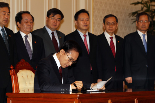 | ▲ 한미FTA 이행법안에 서명하고 있는 이명박 대통령 ⓒ연합 |