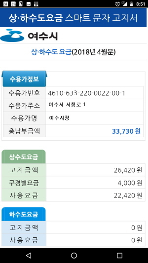 서비스 신청은 여수시 상하수도 요금 사이버창구에서 가능하다. 본인인증 후 수용가번호와 휴대전화 번호를 입력하면 신청이 완료된다.