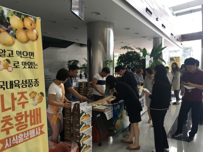 나주시거점유통센터(APC) 주최로 열린 판촉행사는 15일 한국농어촌 공사를 시작으로 한전KDN, 인터넷진흥원 등 공공기관 3곳에서 점심시간대를 활용해, 직원들에게 추황배와 배 즙 시식행사를 운영하는 등 나주 배 품종의 우수성을 적극 홍보했다.