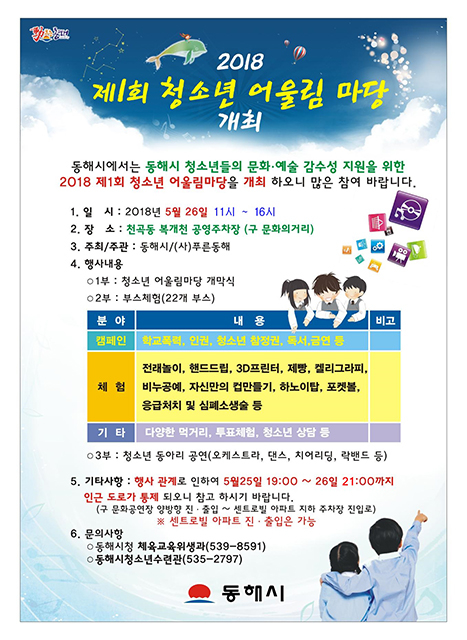강원 동해시(동해시장 권한대행 김종문)는 오는 26일 오전 11시 천곡동 복개천 공영주차장에서 ‘2018 제1회 청소년 어울림 마당’을 개최한다.