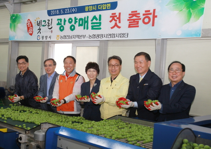 광양시는 5월 23일 다압농협 매실선별장에서 신현숙 광양시장 권한대행, 농협중앙회 전남지역본부 본부장, 광양시지부장 등 10여 명이 참석한 가운데 광양매실 첫 출하식을 가졌다고 밝혔다.