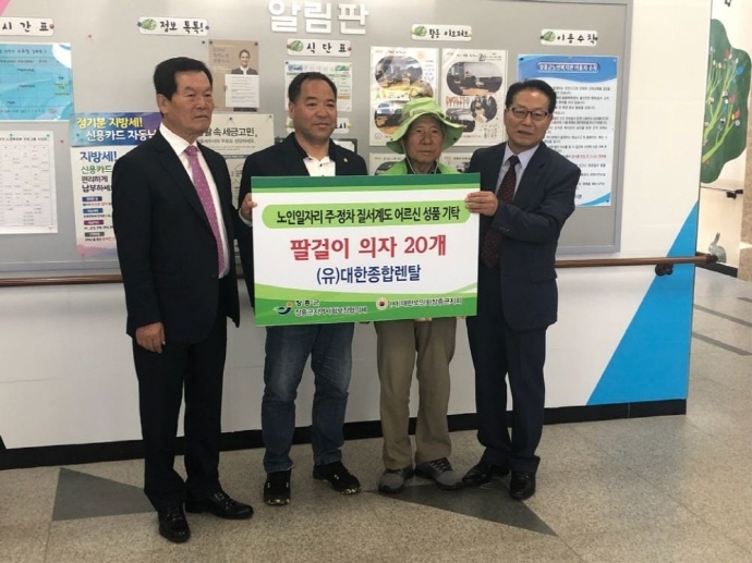장흥군지역사회보장협의체(공동위원장 김규탁, 위삼섭)는 지난 23일 (유)대한종합렌탈(대표 김순석)로부터 팔걸이 의자 20개(30만원 상당)를 후원 받아 (사)대한노인회장흥군지회 '노인일자리 주·정차질서계도 어르신'들에게 전달했다.