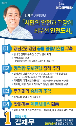 김재무 후보는 첫 번째 공약 ‘책임지는 시민안전 편’에서는 ‘시민의 안전과 건강이 최우선인 안전도시 실현’ 공약을 내놓았다.
