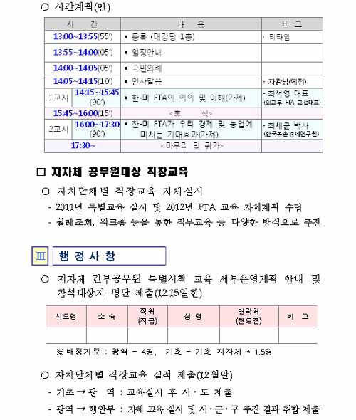 특히 행안부는 '붙임 자료'에서 "지자체 공무원 대상 직장교육', '자치 단체별 직장 교육 자체실시', '2011년 특별교육 실시 및 2012년 FTA 교육 자체계획 수립', '월례 조회, 워크숍 등을 통한 직무교육 등 다양한 방식으로 추진'이라고 명시했다. 월례 조회에 전 공무원이 참석하는데 비춰보면, 사실상 지자체 공무원 전원을 대상으로 교육을 실시하겠다는 의미로 풀이된다.