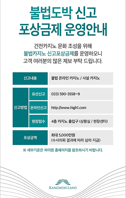 한편, 강원랜드는 불법도박 단속을 위한 전담조직인 불법도박감시TF를 지난 12월 신설, 운영하고 있으며 유선 및 하이원리조트 홈페이지를 통해 온·오프라인 불법도박 관련 신고 제보를 받고 있다.