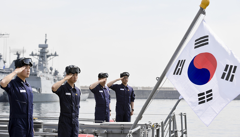현충일 맞아 태극기에 경례하는 해군 1함대 장병들