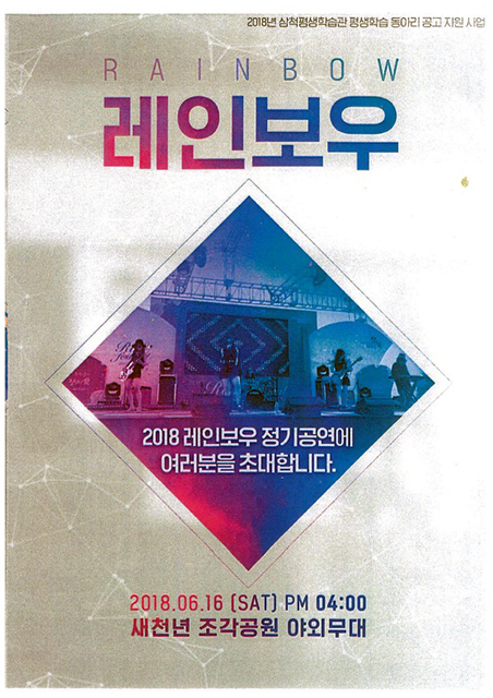 ‘레인보우(대표 김미자)'는 삼척평생학습관에서 학습을 통해 육성된 동아리로 2010년에 결성되었다.