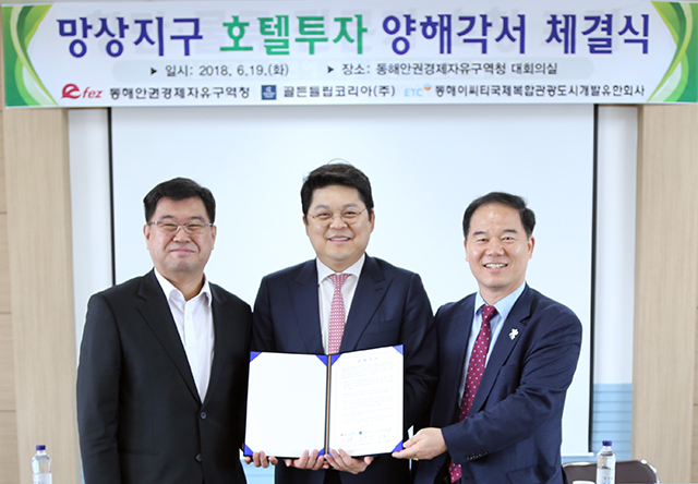 동해안권경제자유구역청(청장 신동학)과 골든튤립코리아주식회사(사장 김민수)는 19일 동해안권경제자유구역청 3층 대회의실에서 망상지구 예비개발사업시행자인 동해E-City(사장 남헌기)와 함께 호텔분야 투자 및 운영을 위한 양해각서를 체결했다.