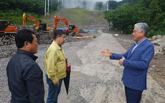 정선군에 따르면 최 군수는 지난달 26일 103㎜의 강우에 이어 1일 현재 46.5㎜의 비가 내려 지반약화 등 산사태 발생 가능성이 높아짐에 따라 현장을 방문해 현장상황을 둘러보고 관계자들에게 대응책 강구를 지시했다.