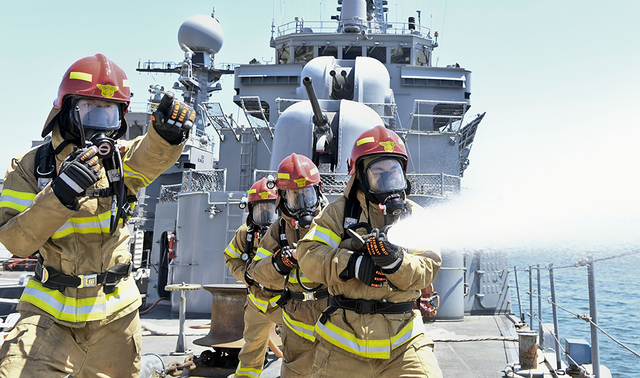 해군 1함대, 부산함서 화재진압훈련
