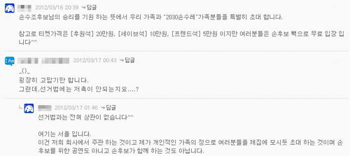<프레시안>이 추가로 확보한 손 후보 팬클럽 게시판 캡쳐 사진의 댓글 내용을 보면 "손수조님의 승리를 기원하는 뜻에서 우리 가족과 '2030손수레' 가족분들을 특별히 초대합니다. 참고로 티켓 가격은 후원석, 20만 원, 세이브석 10만 원, 프렌드석 5만 원이지만 여러분들은 손 후보 빽으로 무료 입장입니다"라는 표현이 나와 있다. "손 후보 빽으로 무료 입장"이라는 표현은 문제될 소지가 많다.