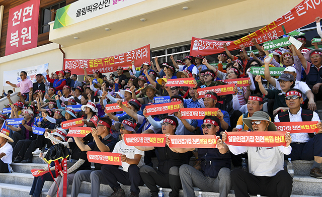 정선군번영회는 성명서를 통해 “지난 2월 9일 횡계에서 김남기 선생님의 아라리 가락이 전세계에 울려 퍼지던 기억은 모두의 가슴에 남아있다”며 “전세계인들이 찬사를 보내던 정선알파인경기장이 잘못된 인식을 가진 자들의 원상복원 요구를 규탄하려고 무더위 속에 모였다”고 주장했다.