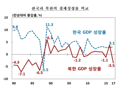 한국은행이 20일 발표한 '2017년 북한 경제성장률 추정 결과'를 보면 지난해 북한의 실질 국내총생산(GDP)은 전년보다 3.5% 감소한 것으로 추정됐다.