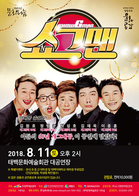 올 여름 무더위를 시원하게 날려 줄 버라이어티 개그쇼 ‘쇼그맨’이 오는 8월 11일 오후 2시 태백문화예술회관 대공연장 무대에 오른다.