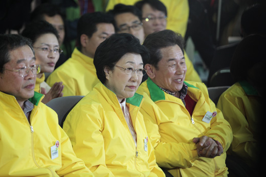 이용득 최고위원과 이석행 선대위원장 사이에 앉은 한 대표는 출구조사 발표 전까지 별다른 발언 없이 두 손을 모으고 상황실에 설치된 텔레비전을 응시했다.