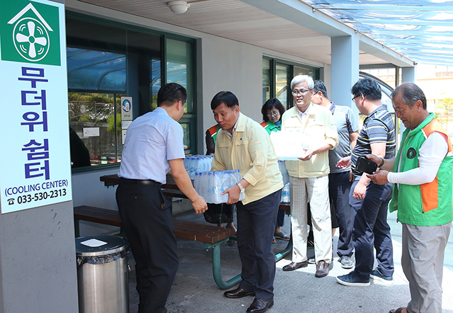 강원 동해시(시장 심규언)가 연일 계속되는 폭염에 다양한 대책을 마련해 추진 중인 가운데 최근 지역자율 방재단과 함께 무더위쉼터, 관내 경로당 112개소, 노인종합복지관 2개소를 비롯해 야외 근로자들에게 생수와 얼음물을 배송했다.