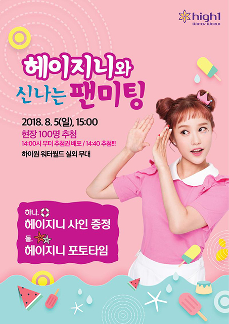이날 팬미팅에서는 2시부터 추첨권을 배포해 사전 추첨을 통해 선정된 100명에게 헤이지니의 사인을 증정하고 포토타임의 기회도 제공한다.