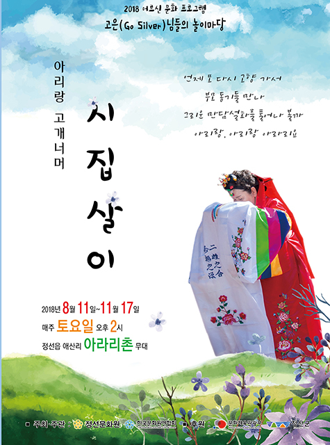 ‘아리랑 고개너머 시집살이’는 땅 끝 해남에서 정선으로 시집와 산선수전 다 겪은 어르신의 구술을 토대로 소리로 전해 내려오는 정선아리랑 소리와 함께 그 속에 담긴 내용을 ‘아리랑 고개너머 시집살이’라는 이야기로 풍물, 연극, 춤, 아리랑이 어우러진 특색 있는 마당극 형식의 연극으로 새롭게 재구성해 선보인다.
