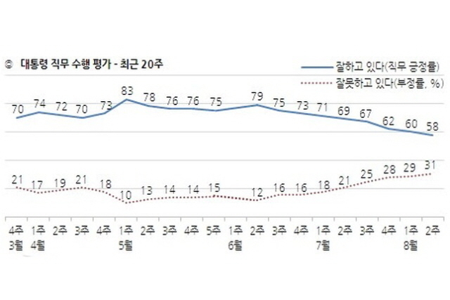 여론조사기관 '한국갤럽'의 10일 발표에 따르면, 이 기관의 매주 정례 실시하는 대통령 직무수행 평가 여론조사에서 '잘하고 있다'는 긍정 응답은 지난주보다 2%포인트 떨어진 58%로 집계됐다. 반면 '잘못하고 있다'는 부정 응답은 2%포인트 오른 31%였다.