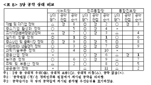 종합적으로 분석할 때, 3당 중 민주통합당이 '상대적 우위'에 있는 공약을 가장 많이 냈다. 11개 분야 중 6개에서 상대적 우위를 나타냈다. 총선 화두였던 '경제 민주화' 관점에서 제시된 공약도 민주통합당의 경우 11개 분야에서 7개를 차지한다. 반면 새누리당은 상대적 우위에 있는 분야는 2개, 경제민주화 관점에서 제시된 공약은 3개에 그쳤다. 새누리당, 민주당 모두 일자리창출을 제1의 공약으로 내세웠다. 통합진보당은 금융산업 정책 개혁을 1순위로 제시했다. 최근 다주택자 세금 감면, 강남 투기 지역 규제 완화 등 '집부자' 정책을 적극 추진하는 새누리당은 역시 부동산 정책을 2순위 공약으로 내 놓았다.
