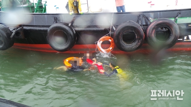 한편, 운전자 김 모 씨는 카케리운반선 출항수속 업무를 종료 후 사무실 복귀 중 투산 차량이 빗길에 밀려 해상으로 추락하였으며, 구조를 위해 바다에 뛰어든 동료 김 모 씨와 예인선 우성호 선장 이광성 씨가 던진 구명환을 붙잡고 해상에 떠 있다 해경에 구조되었다.