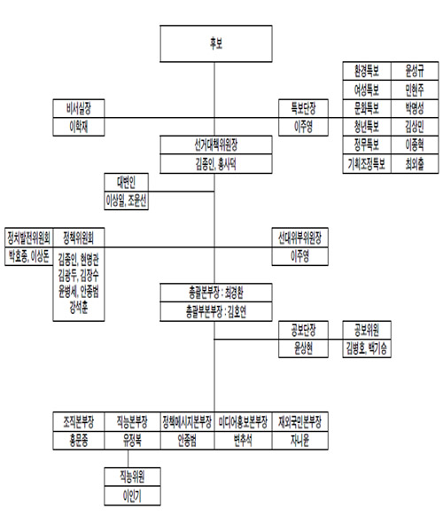 '조직통'으로 유명한 홍문종 의원이 조직본부장을 맡았고, 유정복 의원이 직능본부장을 맡았다. 2002년 한일월드컵 공식 포스터를 제작한 변추석 국민대 디자인대학원장이 미디어홍보본부장을 맡아 주목을 끌고 있다. 정책메시지본부장은 박근혜 의원의 경제 선생 중 한 명인 안종범 의원이 맡았고, 재외국민본부장은 방송인 출신 자니 윤 씨가 맡았다. 윤상현 의원이 공보단장을, 이학재 의원이 비서실장을 맡는다.