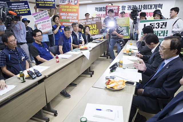 민주노총 역시 한국노총과 마찬가지로 이 대표에게 노동법 개정, 국민연금 개혁을 요구하고, 국제노동기구(ILO) 협약 비준 추진도 촉구했다. 민주노총은 또 "개악 최저임금법 원상회복", "규제프리존특별법·지역특구특례법 등 규제완화 악법 개정 즉각 중단", '쌍용차·전교조 등 노동현안 즉시 해결' 등 4대 의제, 3대 핵심현안을 민주당에 요구했다. 이 대표는 전교조 문제에 대해 "보수정권에서는 노조를 만만하게 보고 교원노조 같은 경우 멀쩡하게 잘 있는 것을 법외노조로 해 버렸다"고 인식을 같이하면서도 "그런 부분을 일시에 해결할 수는 없다. 차근차근 협의해서 정상화를 시켜나가야 한다"고 다른 태도를 보였다. 김명환 위원장은 노동운동가 출신 정의당 이정미 의원의 환경노동위 노동소위 배제에 대해 "요구가 받아들여지지 않아서 섭섭하다. 재고되었으면 한다"고 말하기도 했다.