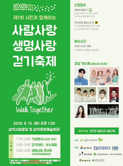 강원 삼척시는 ‘세계자살예방의날’을 맞아 삼척월드휴먼브리지가 주관하고 삼척시가 후원하는 ‘제1회 사람사랑 생명사랑 걷기축제’가 오는 15일 삼척시청 앞 광장 및 문화예술회관 일대에서 개최된다.