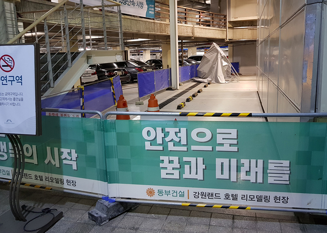 ▲지난 9일 강원랜드 호텔 지하 주차장 인근의 리모델링 현장에 카지노 진입로 고객동선 안내 표지가 설치되지 않아 고객들이 통행에 불편과 혼란을 겪고 있다. 시공사인 동부건설은 공사현장에 ‘안전으로 꿈과 미래를’ 이라는 차단벽에 안전강조 문구를 표시했지만 통행 고객들을 위한 안내 표지는 설치되지 않고 있다. ⓒ프레시안