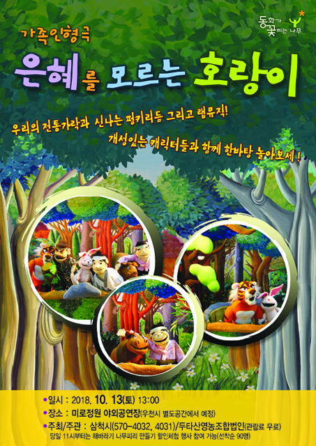 아울러 오는 10월 13일 오후 1시에는 미로정원 야외공연장에서는 초청 가족 인형극 ‘은혜를 모르는 호랑이’를 공연할 계획이다.